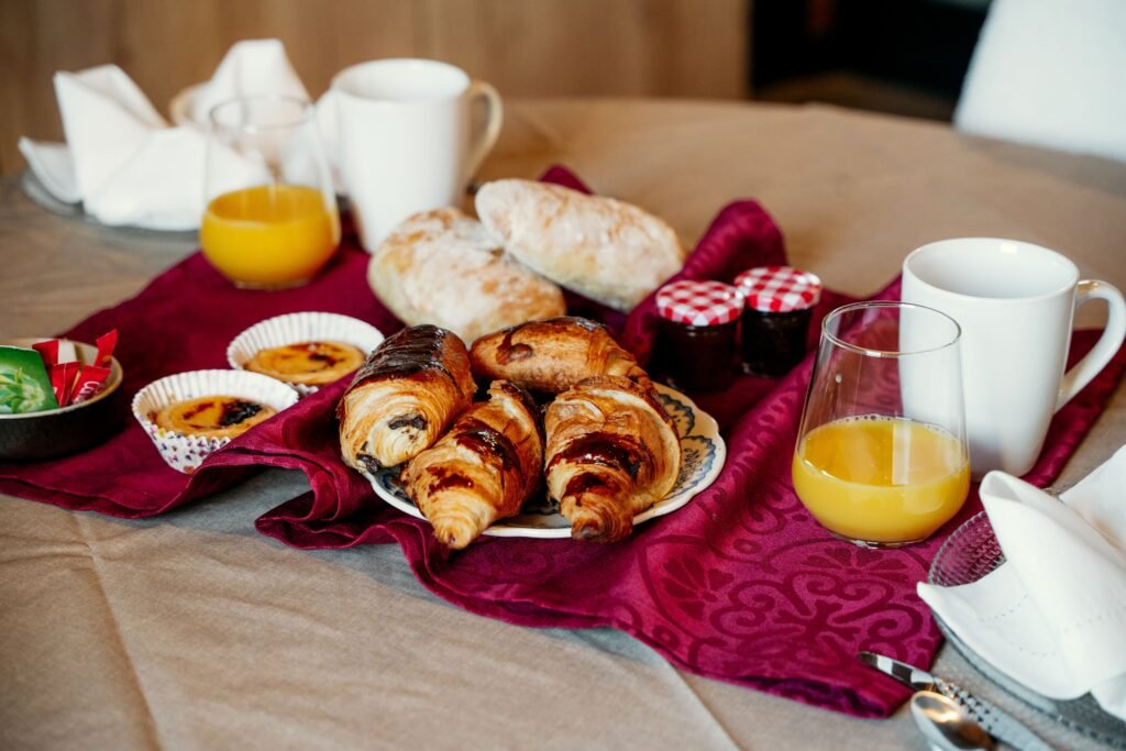 Petit déjeuner composé de viennoiseries, jus de fruit, boissons chaudes & confitures